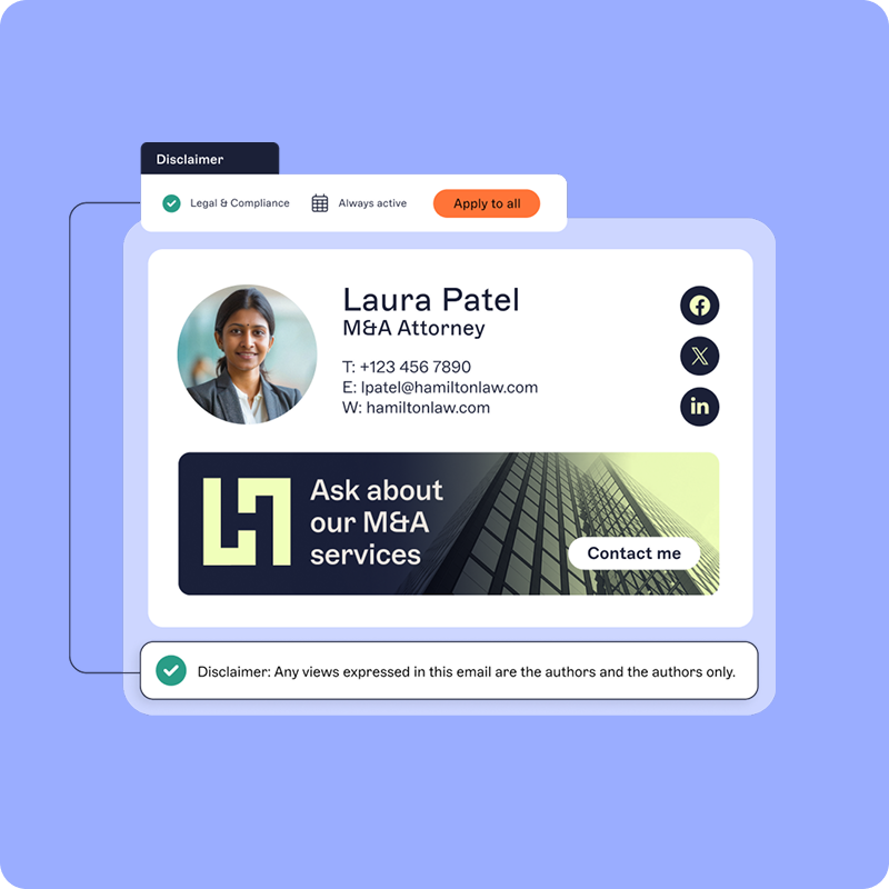 Automate legal disclaimers. Automatically apply HIPAA, GDPR, and industry-specific disclaimers to every email — without relying on users to add or modify them.