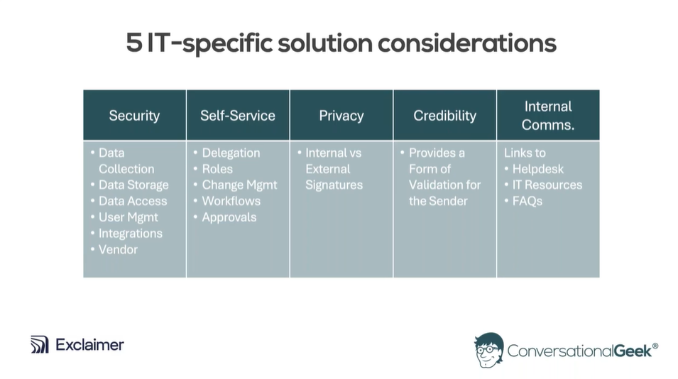 Lors d'un récent webinaire axé sur l'IT, Nick Cavalancia, 4 fois MVP Microsoft et PDG de Conversational Geek, et Karl Bagci, responsable de la sécurité informatique chez Exclaimer, ont détaillé les cinq considérations IT essentielles à prendre en compte lors de l'évaluation d'une solution de signature email. Si vous êtes chargé d'évaluer une plateforme, voici ce que vous devez savoir.