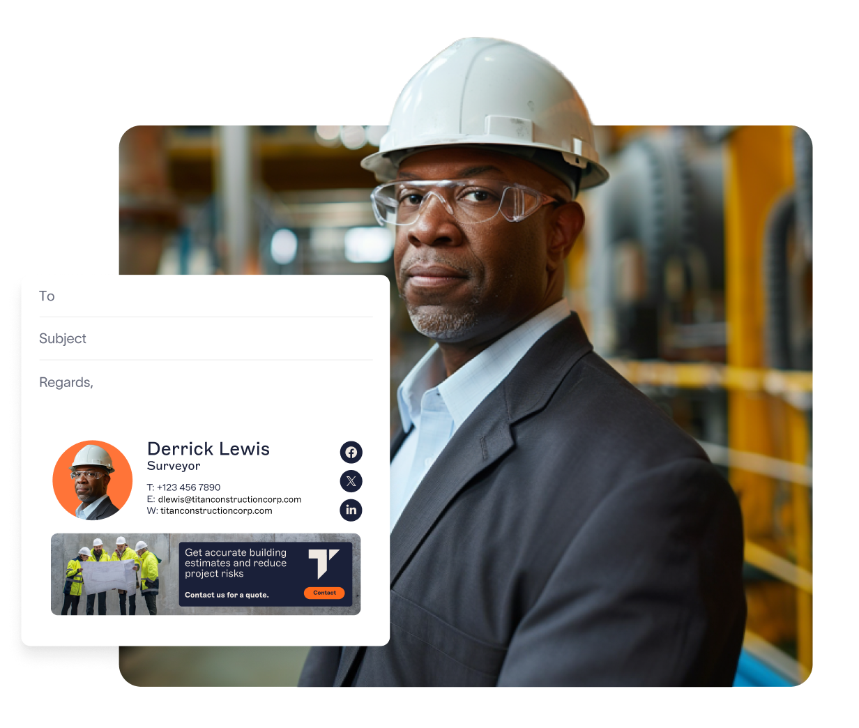 Use our drag-and-drop editor to create professional email signatures. Add company logos, contact details, project info, and safety certifications.