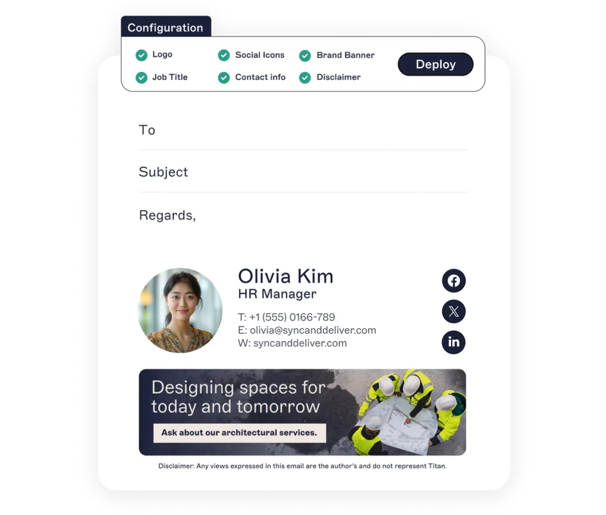 Set up signature templates based on business unit, location, seniority, or regulatory region. Every message follows internal policy and meets compliance needs.