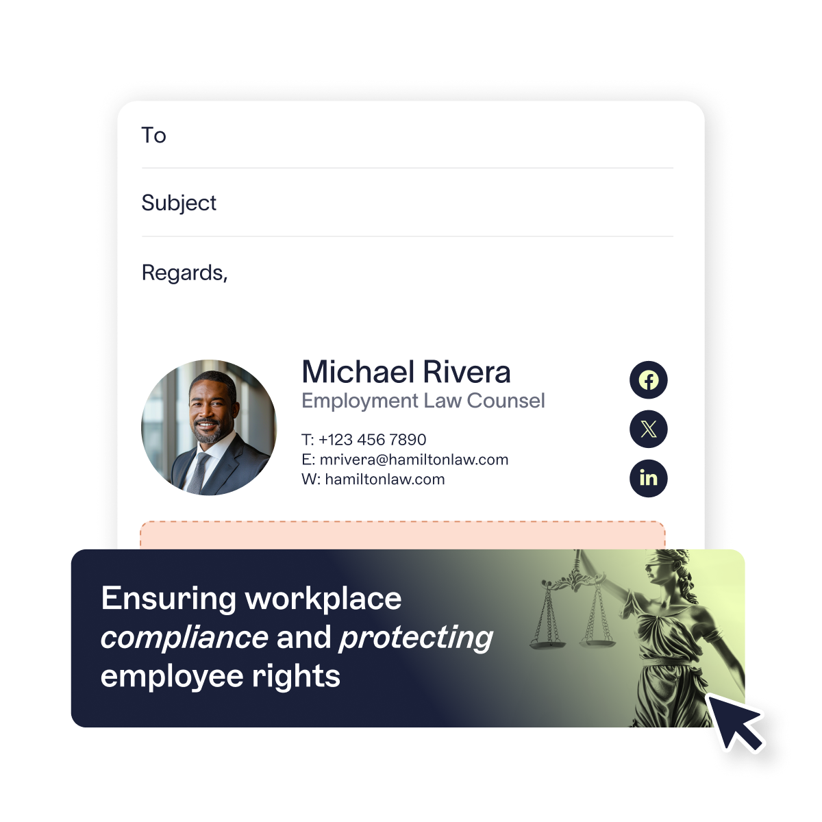 Assign signatures dynamically based on practice area, jurisdiction, seniority, or location, ensuring every email is relevant and fully compliant.