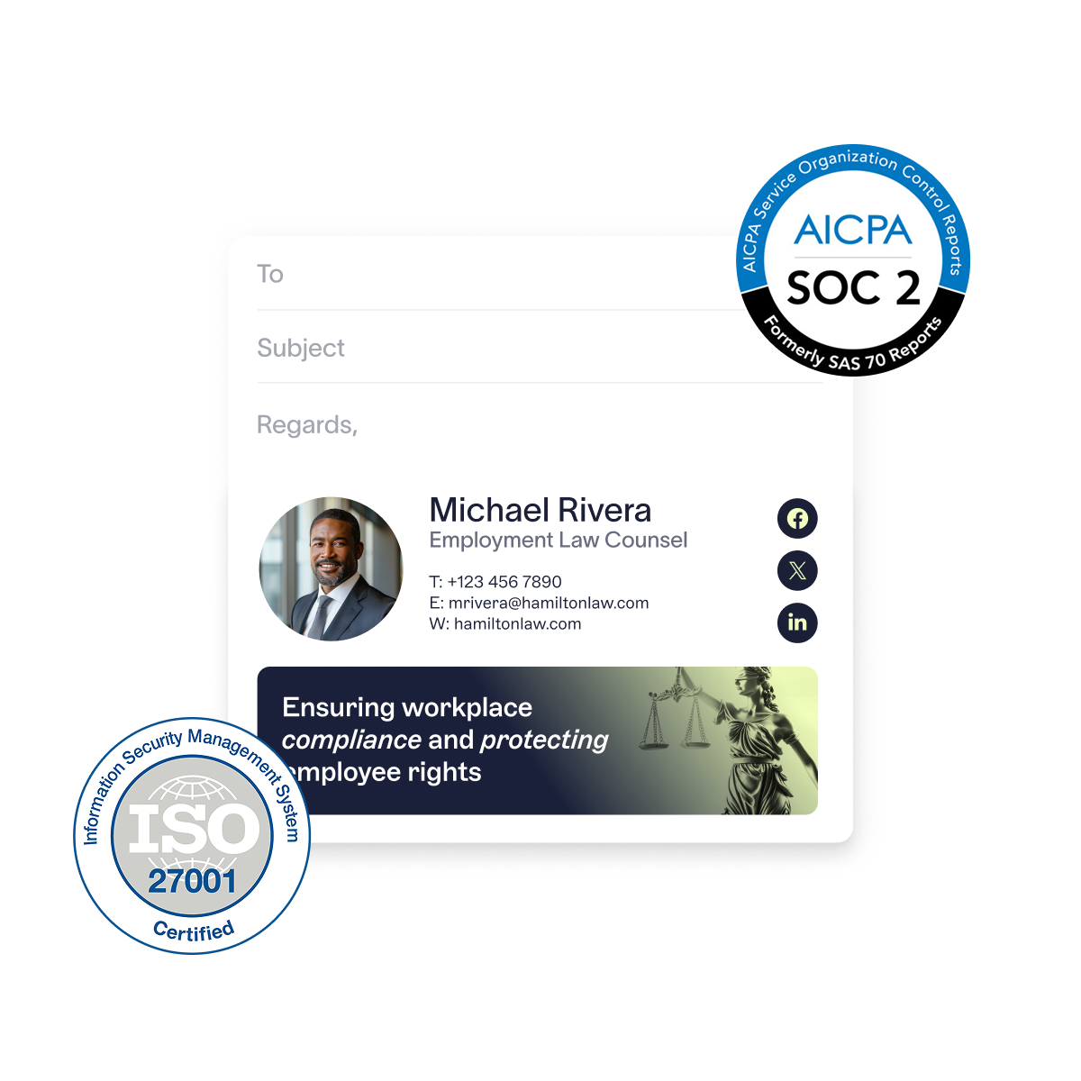 Absolutely. Exclaimer enables firms to automate the application of legal disclaimers, enforce standardized signature policies, and maintain audit-ready records for regulatory review. With compliance certifications like SOC 2 Type II, ISO 27001, ISO 27018, GDPR, and Cyber Essentials, Exclaimer is a trusted solution for law firms and in-house legal teams.