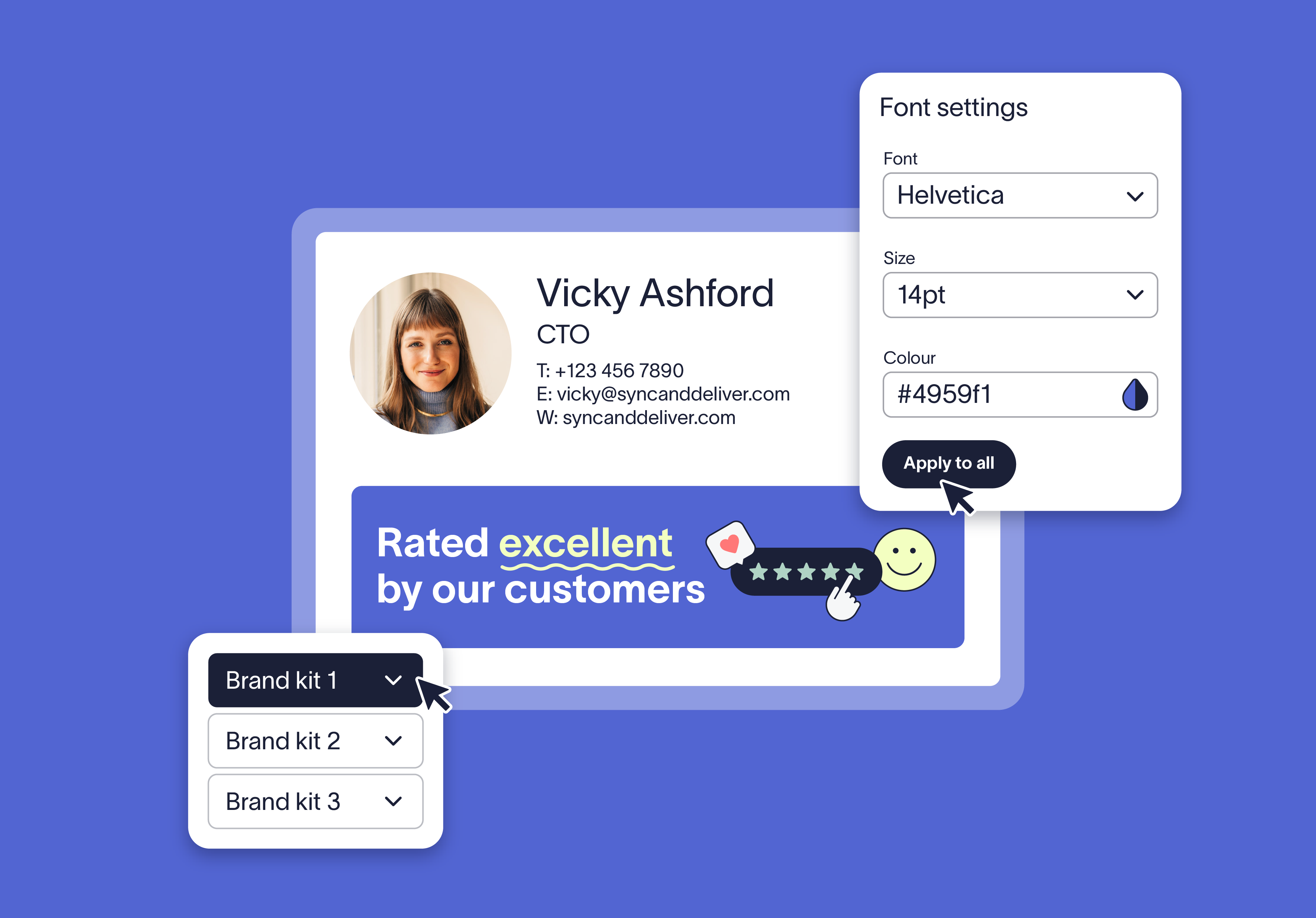Centralizing brand assets into set Brand Kits for each of your brands eliminates repetitive tasks like re-uploading the logos or defining colors and copying hex codes for every signature, across each of your brand's templates. Updates to every Brand Kit applies everywhere it is linked, reducing manual work, cutting down on errors, and streamlining brand management at scale.