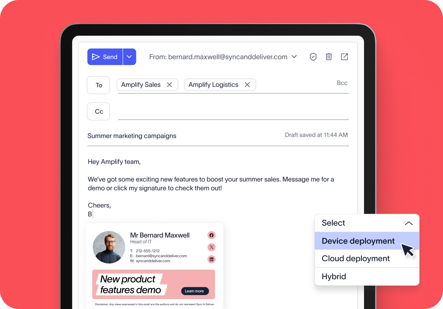 Combine device-side deployment with cloud deployment to cover every angle. Employees see their signature in real time as they compose emails, while IT knows every message — sent from any device or platform — still carries the correct, compliant signature at delivery.