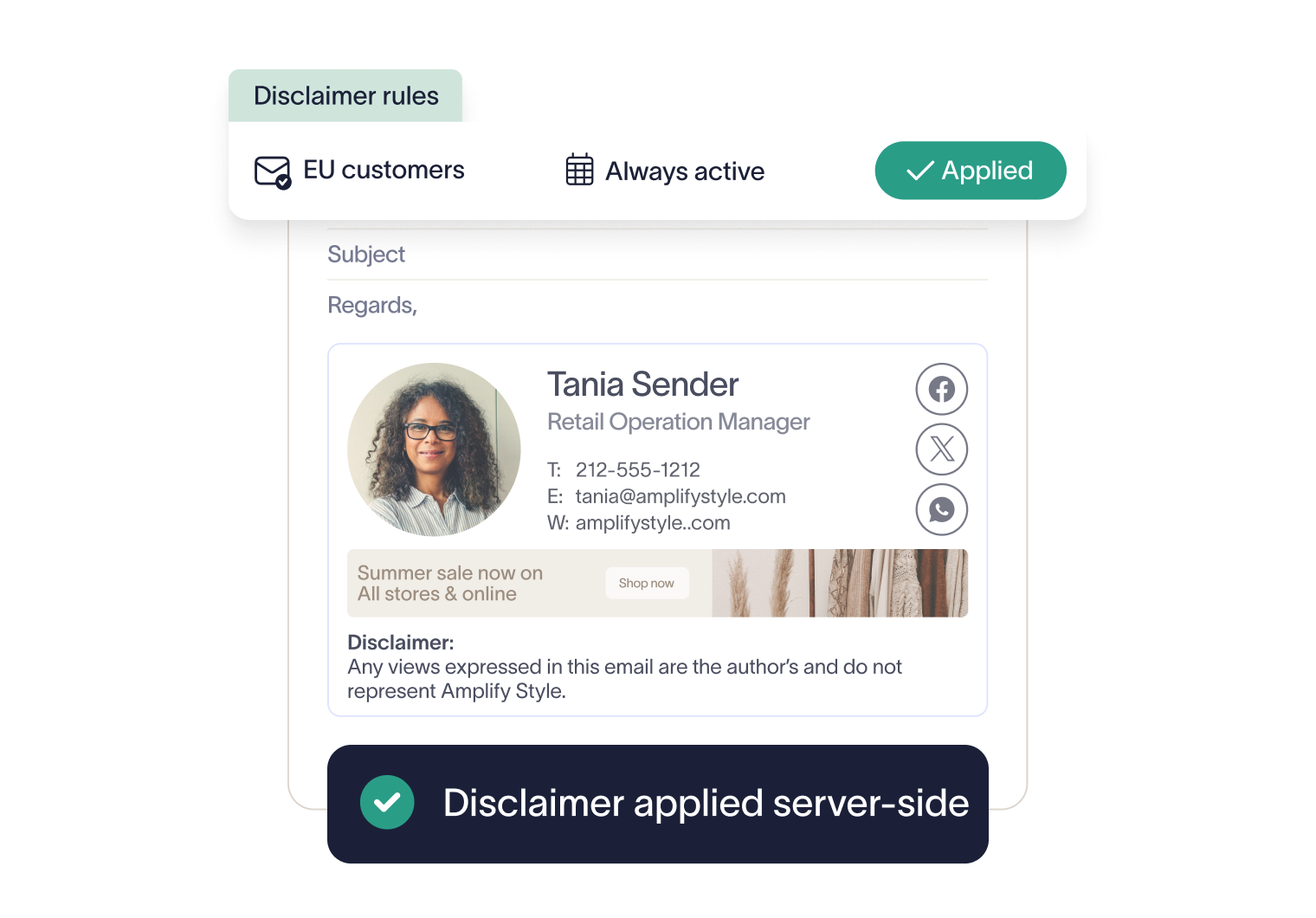 Manage every disclaimer centrally through Exclaimer’s dashboard. No reliance on employees, no burden on IT – just consistent, reliable compliance company-wide.