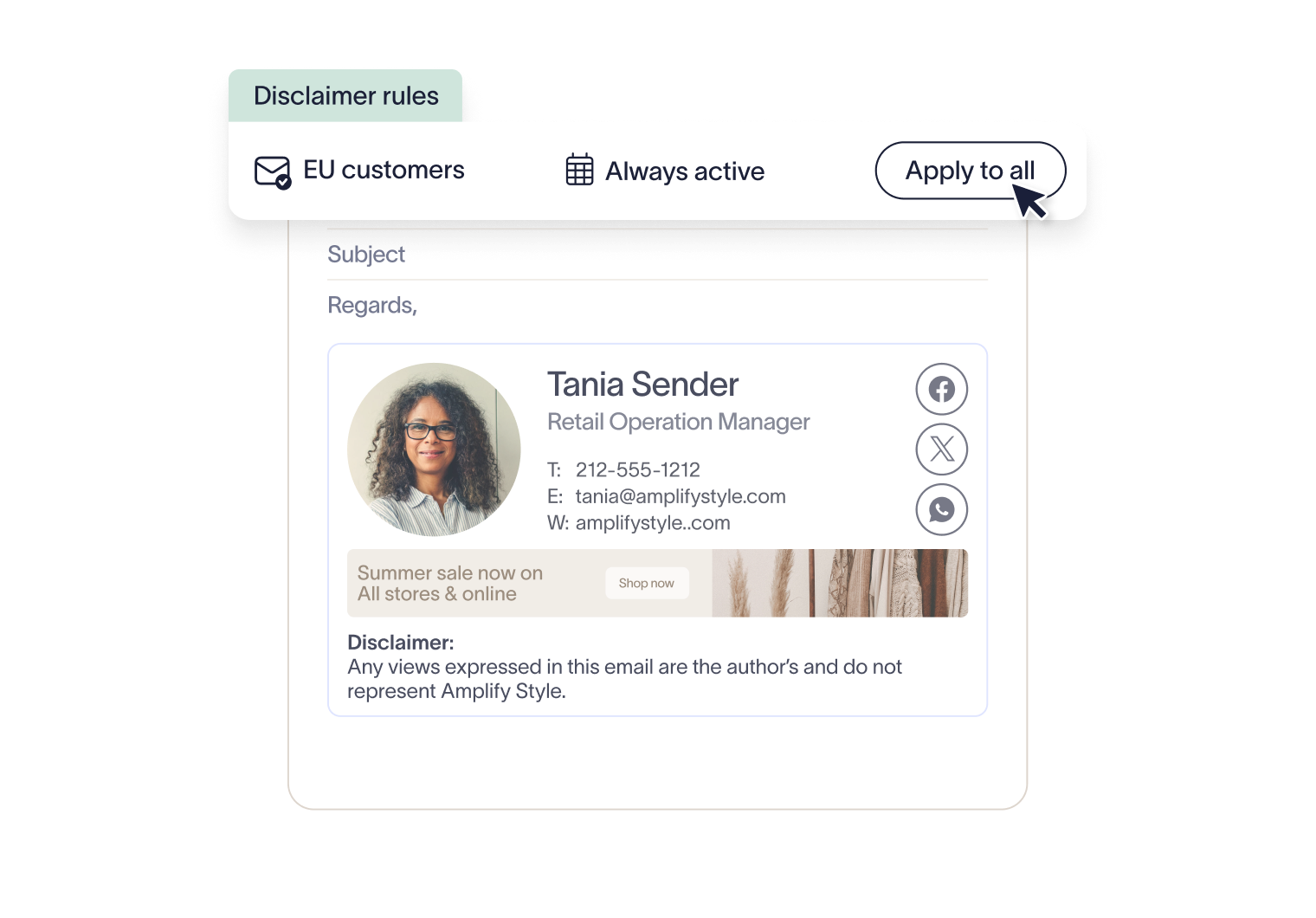 Dedicated settings allow you to tailor disclaimers by sender or recipient. Whether it’s internal teams, external partners, or specific regions, your business can stay compliant while keeping communications relevant.