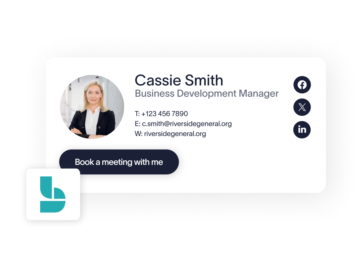 The designer allows you to set custom text, such as "Book a meeting," which can even be customized per department using Exclaimer’s signature rules.