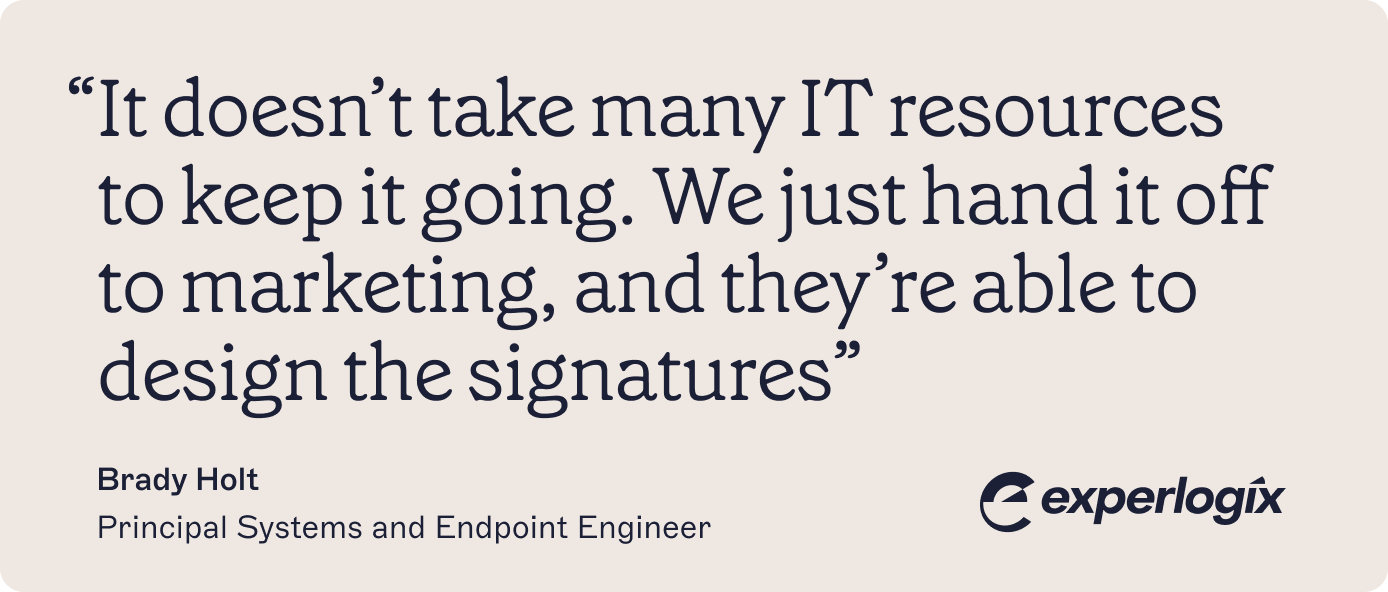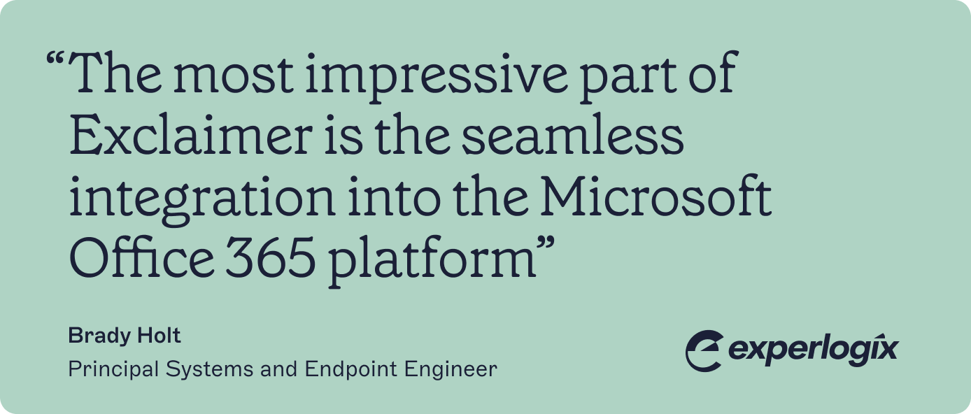The team at Experlogix were aware of Exclaimer and knew it would meet their needs. Brady says, “I had used it at a previous company, so I was very familiar with Exclaimer and loved the product. They were excited about Exclaimer’s ability to streamline branding, especially when dealing with mergers.