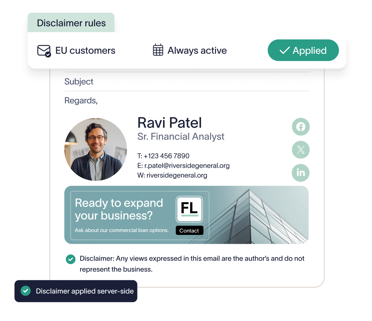 Enforce disclaimers, apply legal text, and prove it all happened with policy-based email signature control.