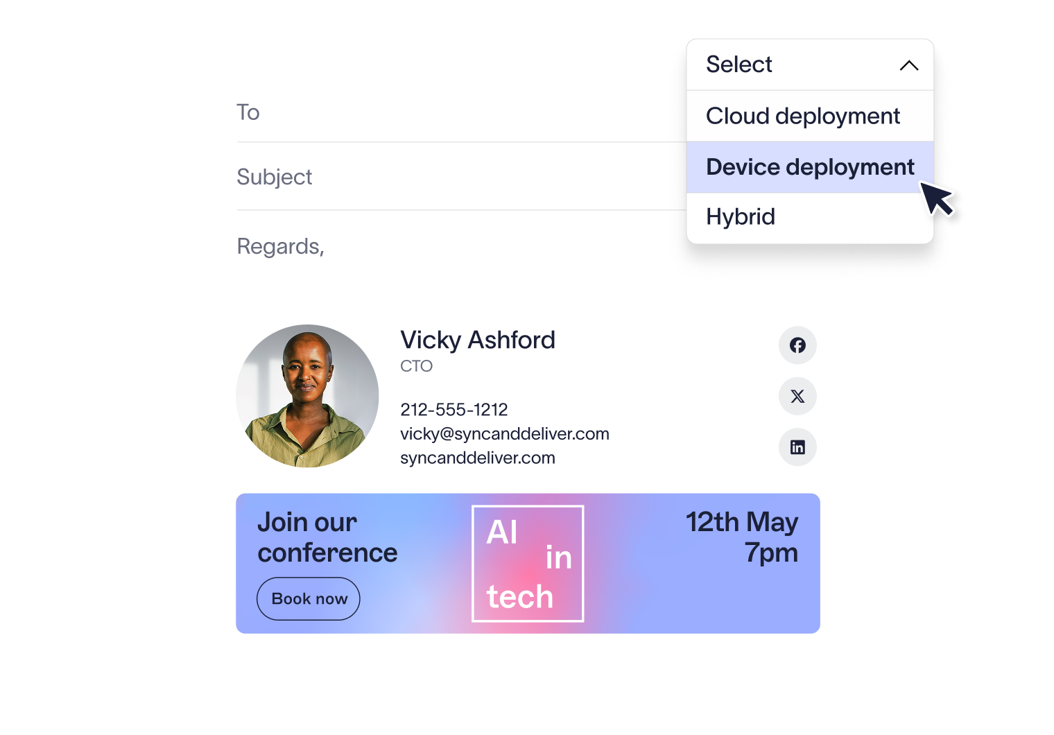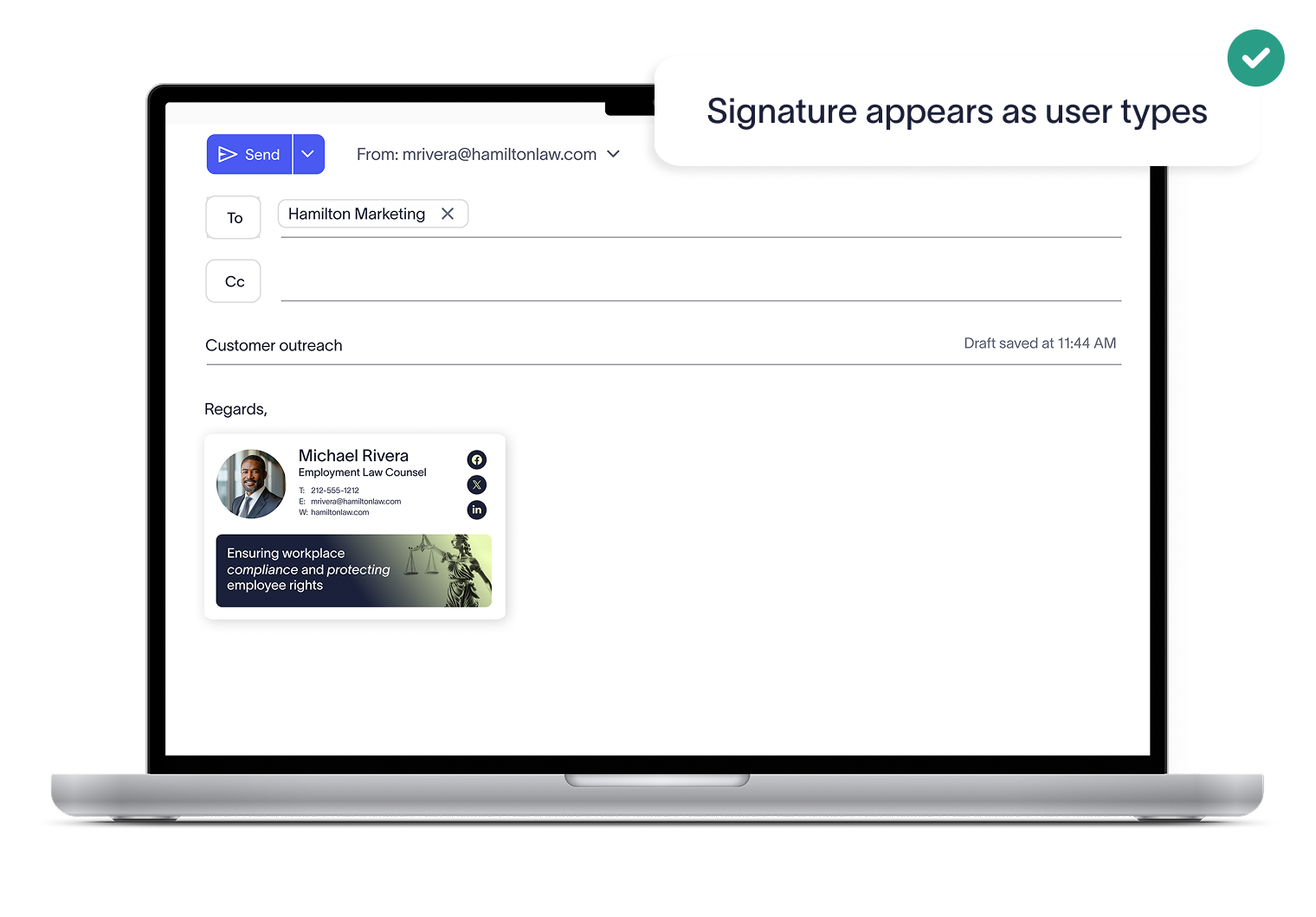Combine device-side deployment with cloud deployment to cover every angle. Employees see their signature in real time as they compose emails, while IT knows every message — sent from any device or platform — still carries the correct, compliant signature at delivery.